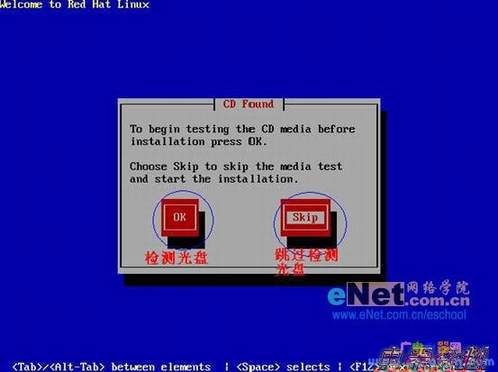 第三步:选择完安装方式后便出现了光盘检测界面,出现这个对话框的意思就是在安装之前确定系统盘是否有损坏,如果确定没有损坏选择“Skip”直接跳过检测进入下个环节。如果选择“OK”则自动转到光盘检测程序自动检测光盘。对于初次接触Linux的朋友,还是建议您在安装之前先检测下系统安装光盘,省去在安装过程中所带来的不便。