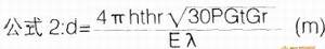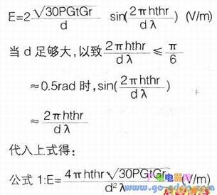 对于工作在300MH2—3G之间的无线通信设备,在视距范围(又称自由空间)内,已知发射功率P(W)、接收灵敏度E( uv)、发射天线R的有效高度Ht(m)及接收天线有效高度Hr(m)、发射天线增益Gt及接收天线增益Gr(单位均为倍,而不是dB)、载频波长λ(m),则通信距离d(m)可由下式描述: