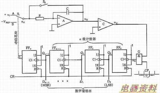 图11.11.1是这种转换器的原理电路,它由积分器(由集成运放A组成)、过零比较器(C)、时钟脉冲控制门(G)和计数器(FF0~FFn)等几部分组成。