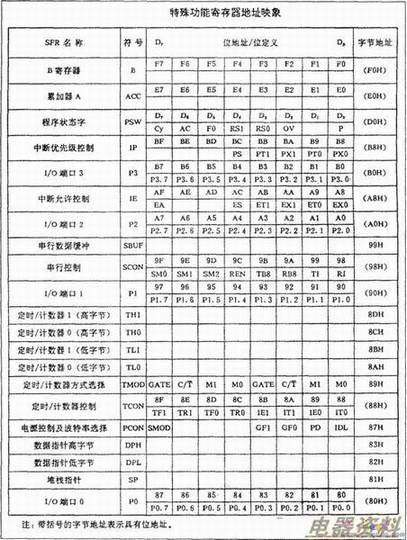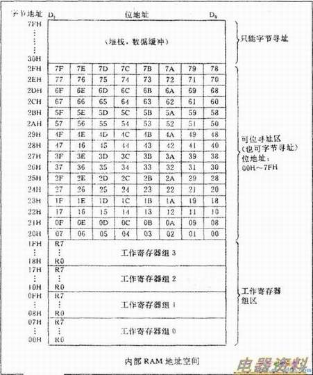 其中,地址OOH~1FH区为工作寄存器区,又分四组,每个时间内只能有一组寄存器工作;地址20H~2FH为128个位寻址区,位地址为OOH~7FH,内部数据存储器的位寻址空间(128位)与SFR的位寻址空间(128位)一起构成了80C51中的256位的位寻址空间。