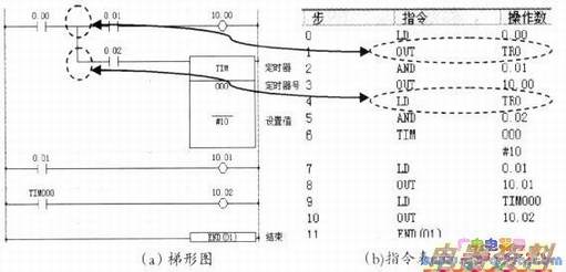 分支电路也可以采用下图(a)的方法来处理,其作用同图1(a)完全一样,而且更为形象直观,但他们的指令是不一样的,在下图中使用了暂存继电器TRO,它是将触点0.00状态存放在暂存继电器TRO中,在需要的时候调用它。