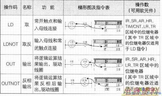 取指令、取反指令、输出指令、输出指令的操作码、名称、功能、梯形图及指令表、操作数见下表。