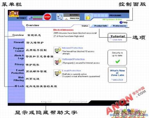 ZoneAlarm的Overview能够很快的让你了解到最近所遭受到的入侵攻击,包括一些常规详细和设置。