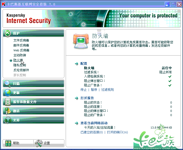 如果您同时安装了火狐浏览器与卡巴斯基互联网安全套装7.0。那么您在上网冲浪时可能会出现网页不正常显示的情况。此情况可能是由卡巴斯基互联网安全套装7.0防火墙的不正确设置所引起。正确设置防火墙参数,我们推荐您按如下步骤进行操作:
