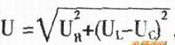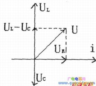假定电阻、电容、三者串联(见上图),由电工学知识知道:流过电阻上与是同向的,即没有;而流过电容上的电流比电压超前90°(假定逆时钟时针为超前),流过电感线圈上电流比电压滞后90°,则它们就有如下图所示的矢量关系(假设电感线圈上UL大于电容两端电压U。),由下图可知:电路两端总电压