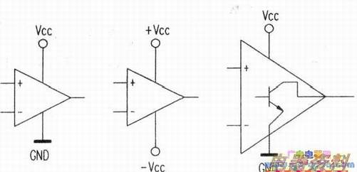 电压比较器有的使用单工作,如下左图所示。有的单和双电源都可以使用,如下中图。我们经常使用的四电压比较器LM339,既可使用最大值36V的单电源,也可使用±18V的双电源。电压比较器的输出端,有的自身可以输出高电平及低电平,例如输出级采用推挽式结构的;而有的电压比较器输出级是一只集电极开路的三极管,称作集电极开路输出,参见下右图,也有场效应管漏极开路输出型,与集电极开路输出型类似。对于集电极开路输出和漏极开路输出的电压比较器,使用时要连接R,输出端才可能有高电平,如右图所示。上拉R-端连接在比较器的输出端,另一端则有两种选择:一是连接在芯片自身的电源端V上,如右图a,二是连接至另一独立电源,如右图b中的Vcc2上。其中第二种连接方法可以用来改变传输电平,用低电平逻辑控制高电平逻辑,或者相反。