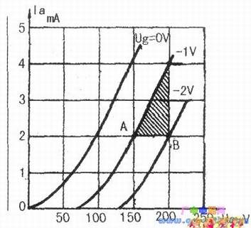 对二极电子管而言只有两个主电极,其板流特性亦取决于板压(特殊用途除外)。所以,其板流特性曲线即由板流构成Y轴,板压构成X轴的伏安特性。三极管加入控制栅极以后,板极既受板压控制,同时也受到栅极电位控制,为了同时反映出两电极对板流的影响,常用的表示方法是在类似二极管的板压一板流坐标图中,以不同的栅极电位为基准,列出多条板压一板流特性曲线,构成所谓栅压一板极特性曲线族,通常写作Ug(Ua-Ia)特性曲线族。下图所示为三种不向Ug值的Ug(Ua-Ia)特性曲线,在此曲线中,可从X、Y轴中读出Ug从0V到-2V,板压从0V~250V的任意点所对应的板极电流值。例如下图的A点,表示当板压=150V(A点作为垂直线与X轴的交点电压值),栅压Ug=-lV(曲线标准值1时,A点作水平线与Y轴相交的点2mA,即为此状态的板流值。