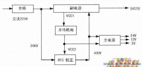 开关电源中的主电源和PFC电路实际上也是两个独立的开关电源,其特点是工作状态受开待机电压控制,一般来说,在电视机工作在待机状态时,主电源和PFC电路是不工作的。另外,主电源和PFC电路的作用不同,前者的作用是为整机其他电路提供所需要的+5V、+12V、+24V直流电压,后者则仅为主电源中的开关管提供约400V左右的直流工作电压。