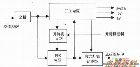 输入220V交流电压和开/待机控制电压,输出直流电压。在液晶电视中,若将开关按功能进行划分,通常可分为全桥整流、副、主电源、开待机电路、PFC电路五部分,见上图。当然,并不是所有液晶电视开关电源都由图中所示的五部分电路组成,某些液晶电视开关电源就没有PFC电路。