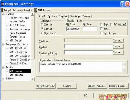 左侧窗口单击ARM Linker,右侧窗口单击Output选项卡,LinkType选择Simple,这里RO Base设置为0x30200000,RW Base为空即可,如图所示。