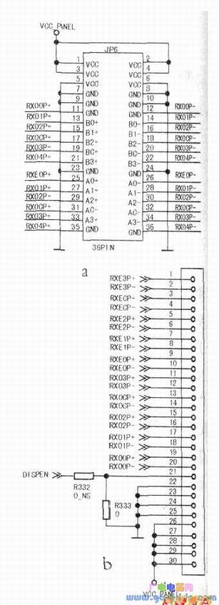 液晶电视的上屏信号处理电路很少由独立的集成块组成,基本上都是由非独立的集成块组成。在电路图中,找液晶电视的上屏信号形成电路,应当首先找到上屏信号输出接口。液晶电视中的上屏信号输出接口通常有两种结构形式,一种是直列式,见下图b;另一种是双排并列式,如下图a。实际上,液晶主板上的上屏信号输出接口采用何种结构并没有强制规定,完全取决电路设计人员的选择。