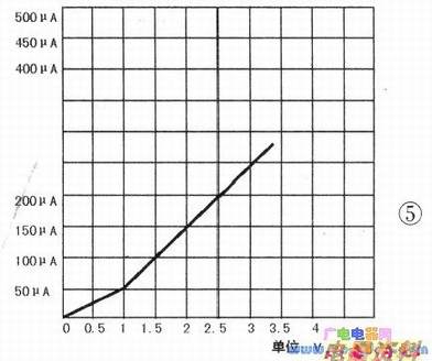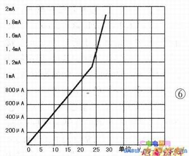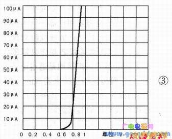 下面以DTC114ESA举例说明测试方法。由于该管基极与发射极卜并联了一只l0kΩ电阻,基极上又串联一只l0kΩ的电阻,如图2所示。数字晶体管e-b结的特性与小信号晶体管e-b结的正反向特性有很大区别,一般晶体管的正向特性曲线如图3所示,从0.7V左右正向电流随正向电压升高迅速上升,方向特性在6V~10V左右开始雪崩,像一只6V~10V的(特性曲线如图4所示);而数字晶体管串联及并联电阻后,输入特性曲线如图5所示。