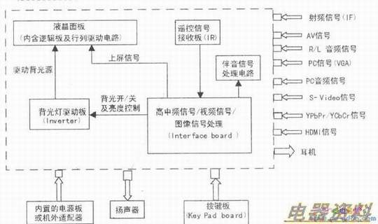 从电路功能上看,液晶彩电的电路仍具有电源电路、CPU控制电路、声像信号处理电路及光栅形成电路四大部分,如下图所示。