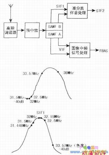 该方式的信号流程如上图所示。当接收B/G、D/K、I制信号时,图像中频通道SAWF的幅频特性曲线如中图所示,从图中可以看出,38M图像中频、33.57MHz色度中频增益最大,而31.5、32、32.5MHz伴音中频被衰减到1%(-40dB);伴音中频通道SAWF的幅频特性曲线如下图所示,31.5MHz、32MHz、32.5MHz伴音中频以及NICAM伴音中频31.448MHz、32.15MHz增益最大,而图像中频色度中频被衰减到1%( -40dB)。具有这种特性的SAWF有两种,一种是图像和伴音SAWF做成一体化,常见型号有K3528;另一种是图像和伴音各自独立,图像SAWF的常见型号有K3955M、K2959M,伴音SAWF常见型号有K9352M、K9261。