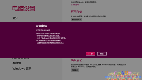 在Windows 8中,微软为大家带来一个用于恢复或初始化电脑的简便方法。当你发现你的电脑运行速度变慢或者存在异常时,恢复选项是十分实用的。只要单击一下或者触摸一下屏幕,你就可以对电脑进行恢复,操作过程不会对你的文件、应用商店下载的应用以及个性化设置带来任何影响。电脑的所有设置将恢复为默认状态,没有同步到Windows账户的桌面应用将会丢失。尽管如此,此方法也可以算作是亡羊补牢的举措了。