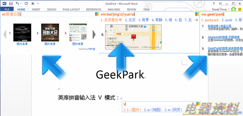 此外,英库输入法最大的特色就是其多媒体输入模式,也叫 V 模式,在输入状态下按下 "v"键,然后选择对对应媒体类型(图片、地图、网页)快速进行内容搜索然后在文档中插入,由下图可以看出,搜索结果都是由必应 Bing 驱动。