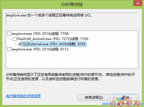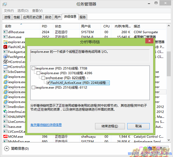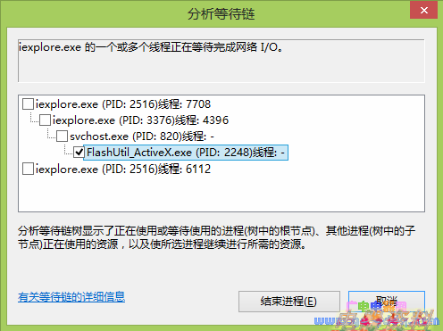 在详细信息里面,我找到iexplore.exe进程,然后右击选择"分析等待链",可以看到,IE的一个或多个线程的确在等待完成网络I/O,而在等待链树状结构中,我们可以看见,它在等待"FlashUtil_ActiveX.exe",PID为2248,可线程信息缺失。