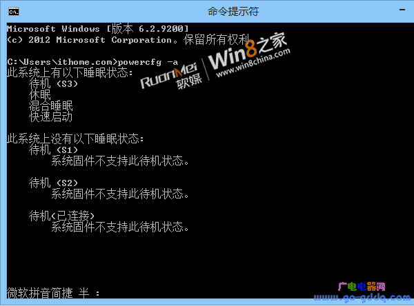 同时按住键盘上面的"Windows小旗子"和字母"R",在弹出的执行窗口中输入“cmd”并运行(软媒小编:其实直接按下Win+X点击“命令提示符(管理员)”这种方式更快),然后在弹出的黑色视窗中输入powercfg -h on 就可以关闭视窗了。当然,你可以运行下 powercfg -a 来查看你电脑里面的睡眠状态。