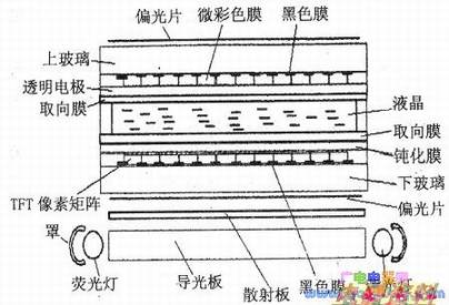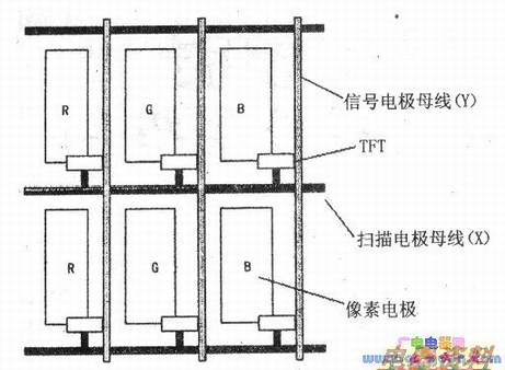 如下图所示。在玻璃板上制作扫描电极母线(X)和寻址电极母线(Y),在其交叉处制作用于选通像素电极的控制开关——薄膜晶体管TFT(Thin FilmTranistor)及像素电极(透明电极)。该像素电极采用姻锡氧化物ITO制成,ITO具有很低的和很高的光学透明性,用它制作控制液晶体的像素电极,才可以让背光源穿过射向液晶体。在上玻璃板上制作整体透明公用电极,并在其上用精细加工方法制作红、绿、蓝(RGB)滤色膜,滤色膜与受TFT控制的像素电极上下对应。滤色膜采用染色、电沉积等方法加工。每一像素由红、绿、蓝三个子像素组成;采用“RGB空间相加混色法”实现彩色显示。