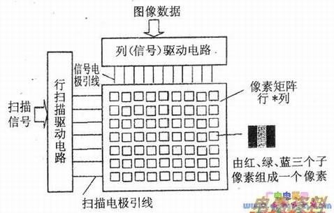 目前用于电脑显示器和彩色电视机的液晶显示屏,均为有源矩阵结构,有源是指通过(有源器件)可对像素独立寻址,如下图所示。