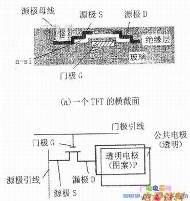 下图(a)是TFT管的横截面图。通过半导体集成工艺将其制作在后玻璃基板上。