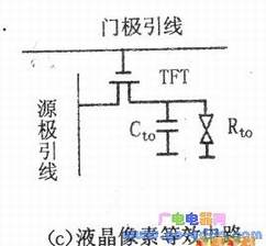 下图(b)是由薄膜场效应晶体管TFT驱动的的一个像素,薄膜晶体管TFT是一个a-Si材料场效应晶体管,当门极上加有脉冲电压时(寻址信号),TFT的源极S与漏极D导通,源极引线上的灰度即加到透明像素电极P上,受P控制的液晶分子呈现出与该灰度电平相对应的透光率。TFT是一开关器件,它的导通与截止状态接近理想开关,因此,各个像素之间的寻址完全独立,从而,消除了各液晶像素之间的交叉串扰。大大地改善了显示图像的和清晰度。