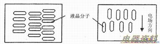 (2)液晶由细长的棒状分子组成,各棒状分子长轴平行,指向某一方向,或分子长轴不完全相同,但宏观上有某一平均方向。正是由于液晶分子有指向性的排列这一特点,使其物理参数在分子长轴方向及其垂直方向取不同值。由于液晶分子的排列结构,不像晶体结构那样坚固,能在电场、磁场、温度、应力等外部条件的影响下,其分子容易发生再排列,使液晶的各种光学性质随之发生变化,液晶这种各向异性及其分子排列易受外加电场、磁场的控制,正是液晶能用于显示器件的物理基础(见下图所示)。