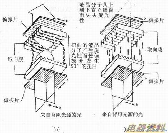 (4)在一对平行放置的偏光板间填充液晶,这一对偏光板的偏振光方向相互垂直。液晶分子在扁光板间排列成多层,通过取向膜使靠近偏光板的液晶分子平行于偏光板偏振方向排列。在不同层间,液晶分子的长轴将沿偏光板平行平面连续扭转90°,与偏光板的偏振方向一致的偏振光,垂直射向无外加电场的液晶分子时,入射光将随液晶分子轴的90°扭曲而旋转射出(称为液晶的旋光性),如下图(a)所示。这种结构称为扭曲向列型液晶显示器。