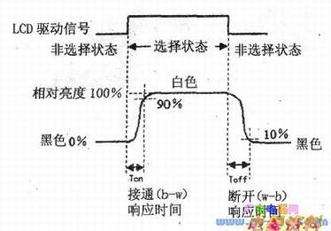 液晶显示器的电一光是指液晶体从暗到亮(上升时间Ton)再从亮到暗(下降时间Toff)的整个变化,如下图所示。