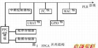 GA片内结构如图1所示,FPGA片内所有模块包括PPC405处理器、MAC核、I2C核、GPIO核及URAT核,都连接到片上高性能PLB总线上,PPC405通过PLB总线来访问每个IP核,各IP核的大致作用如下: