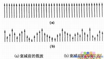 如果信道具有恒定增益和线性相位响应的带宽小于传送信号带宽,信道在接收到的信号上产生频率选择性的衰落,这时接收到的信号包括了多样的传输波形。幅度被衰减,时间被延迟,接收到的信号当然是失真了。频率选择性衰落对载波幅度的影响示意图如图所示。