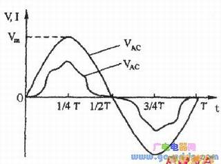 这种无源PFC电路的工作原理是:当50的AC电路电压按正弦规律由0向峰值Vm变化的1/4内(即在0<t≤5ms期间),桥式整流器中二极管VD2和VD3导通(VD1和VD4截止),对电容C1并经二极管VD6对C2充电。