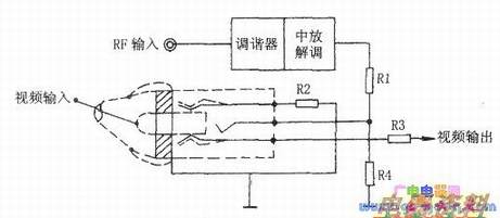 这种输入选择开关设置在视频输入(VIDEO IN)插孔上,当视频输入插孔设有插头插入时,从射频输入(RF IN)插孔输入的视频信号经调谐器、解调电路、Rl、簧片和R3输入到视频信号处理电路;当视频插孔有插头插入时,插头将簧片顶开,断开从“RF IN”插孔来的视频信号,从“VIDEO IN”插孔输入的视频信号经插头、簧片和R3输入到视频信号处理电路。可见,线路输入优先被选择,当需要从射频输入信号时,必须拔下视频输入插头。