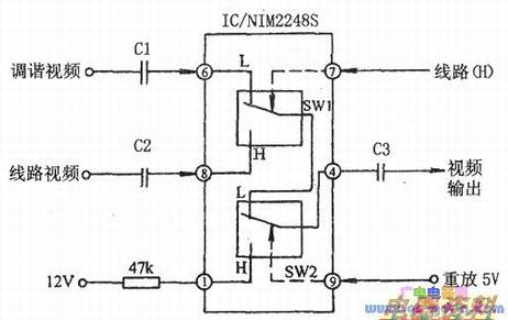当采用线路输入时,IC的⑦脚为高电平(H),开关SW1与下端接通,IC的⑨脚仍为低电平(L),开关SW2仍与上端接通。这样由线路输入的信号经C2、IC的⑧脚、SW1、SW2,再由IC的④脚和C3输出到视频信号处理系统。