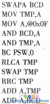 对于程序二的结果如仍然不满意,似乎稍嫌复杂,虽然速度有所改善,但在内存的分配上仍有余地,可以再改善成程序三的型态。转换过程只花费10个指令CYCLE,而且只需要一个变量空间,执行之后也不会改变原来BCD的内容。