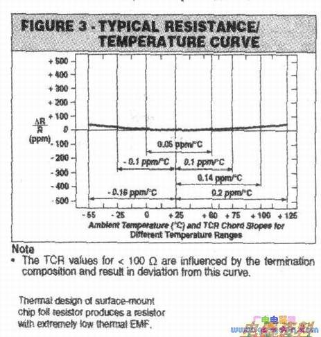 合金特性及其与基片之间的热机平衡力形成的标准,在0℃~+60℃范围内为±lppm/℃(Z箔为0.05ppm/℃)(下图)采用平箔时,并联电路设计可降低,电阻最大总阻抗为0.08uH。最大为0.05pF。1kΩ电阻设置时间在100M以下小于1ns。上升时间取决于电阻值,但较高和较低电阻值相对于中间值仅略有下降。没有振铃噪声对于高速切换电路是十分重要的,例如信号转换。