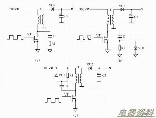 下图 (c)所示的电路与下图 (b)所示的电路工作原理是一样的,但吸收效果要更好一些。目前,液晶彩电的电源尖峰吸收回路基本上都采用了该电路形式。