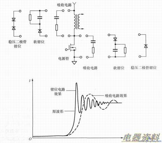实际应用中的尖峰脉冲吸收电路是由钳位电路和吸收电路复合而成的,下图所示是钳位电路和吸收电路在开关电源应用时的不同效果。