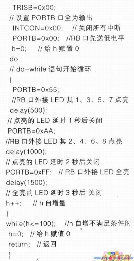 c.LED灯点亮时的无限循环由do_while语句完成,其while(h<=100)中的100可任意选取大于0的其他值。