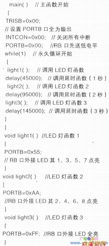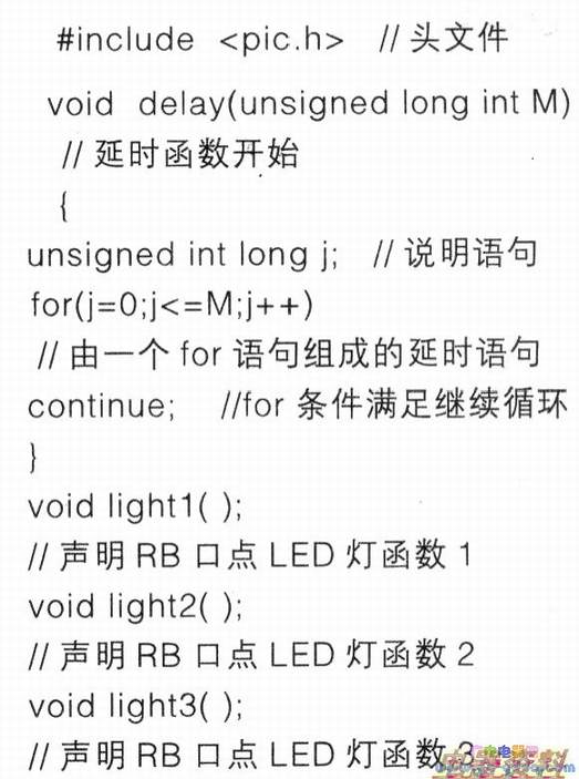 d.上述程序都以LED的各功能函数lightl():light2();light3()完成。程序运行时,由主函数main()调用各LED的功能函数和延时函数,此方法是编辑复杂C程序所必备的。