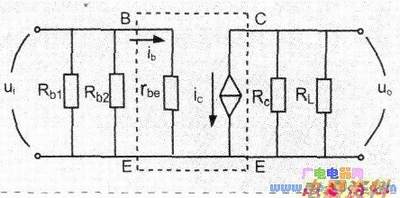 现在,可以画出放大器完整的交流等效电路,它如下图所示。虚线框内是三极管的等效电路,输入信号ui加在B、E之间,输出信号u。从C、E取出。