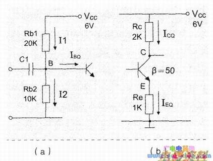 先看看放大器的偏置电路是如何工作的。请看下图(a),在直流V的作用下,有电流I1流过Rb1,到达B点后电流I1分为两路: