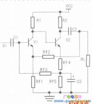 下图中Rfl是V1级的反馈元件,反馈信号与输入信号Ui不交于同一端点故Rfl引入的是Vl级的串联反馈,同样的Rf4和Rf5引入的是V2级的串联反馈,Rf2引入的是级间串联反馈,Rf3引入的反馈信号Ufo与输入信号Ui都交于V1的基极(C1对Ui来说可视为短路),故Rf3引入的是级间并联反馈。