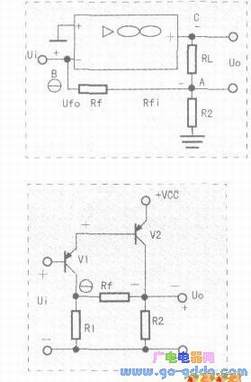 Rf2经输出C2(这里兼作隔直电容,视为短路),交于V2集电极,Ufi和Uo则视为均交于V2的集电极,故Rf2引入的是电压反馈。