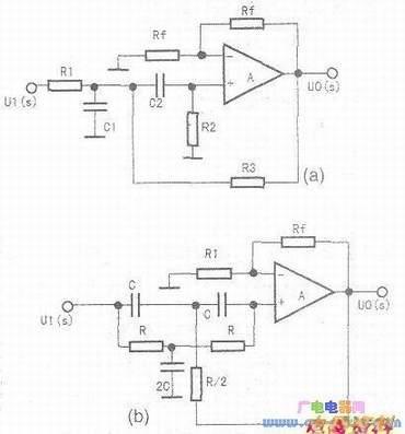 下图(a)为压控电压源二阶有源带通滤波器,下图(b)为一种常用的带阻滤波器带通和带阻的中心频率为