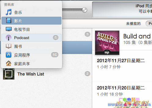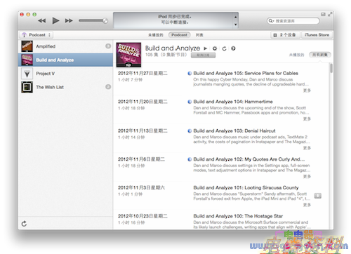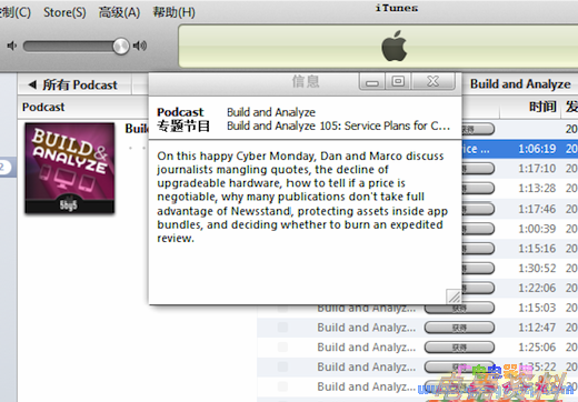 以播客为例,在 iTunes 11 之前的版本中,用户要在多个界面之间进行切换,才能完成播放和筛选这些常用功能。而如果要查看完整的播客内容简介,则必须使用右键菜单,遇到弹出窗口。
