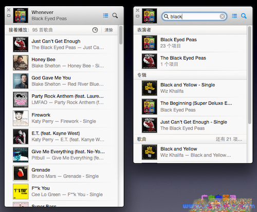 除了上下一首这样常规的功能以外,苹果还给 iTunes 11 的迷你播放器界面添加了可以自定义顺序的播放列表和一个搜索按钮,以便用户通过搜索快速定位歌曲,进行播放或加入当前播放列表。