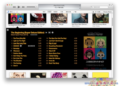 在 iTunes 11 中,iPad 在界面呈现和交互上的很多成功经验被移植过来。例如最明显的“全幅界面”展示专辑封面,与 iPad 上的音乐应用如出一辙: