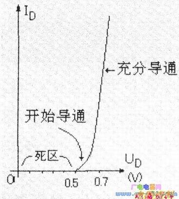 我们把二极管开始导通时的电压(0.5V)称为“起始电压”(也有称之为“门坎电压”),把0~0.5V这一区域称作二极管的“死区”,表示虽然已经加入正向电压,但二极管还没有被激活,还是不导通的。