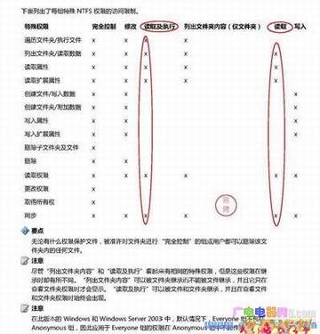 该图是Windows帮助中截取的关于权限的部分。从这幅图上,细心的读者不难看出二者的区别。“读取和执行”比“读取”多了一个“执行文件”的特殊权限。这或许还不能让你理解他们之间的区别,下面我们就用实验来说明问题。